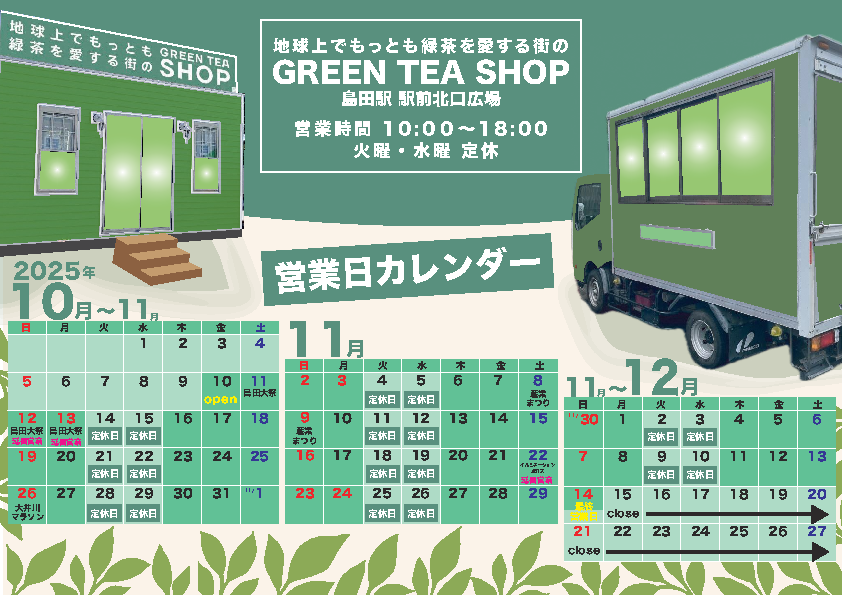 【10/10~12/14】GREEN TEA SHOP がJR島田駅北口駅前広場に期間限定でオープンしています!