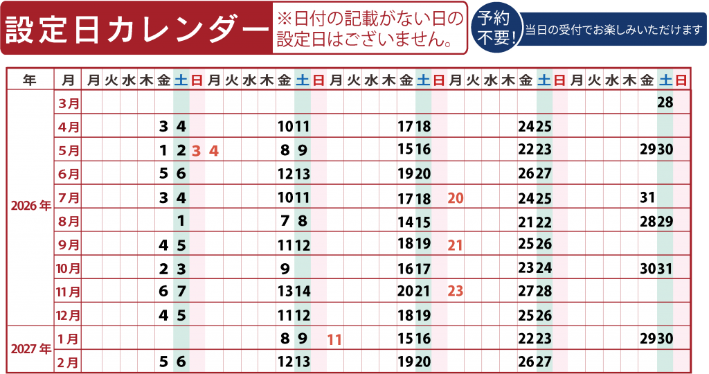 2026年3月6日に設定日カレンダーの更新を行いました。当初の日付に一部誤りがありましたことをお詫びいたします。今一度設定日カレンダーのご確認をお願いいたします。